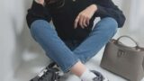 ブラックのバックで引き締めつつ、美シルエットのロールアップストレートデニムパンツと厚底レースアップシューズの相乗効果で脚長スタイルに。