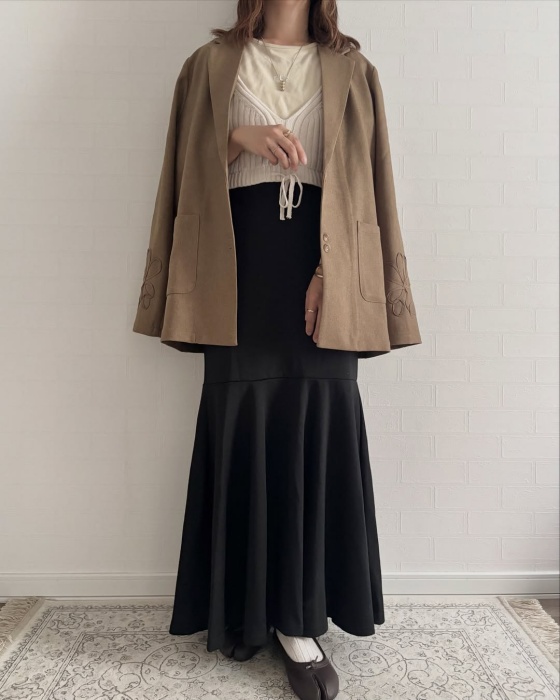 ベージュの刺繍ジャケットを肩掛けする事でこなれ感をアップさせながら、腕の露出を抑えられます。