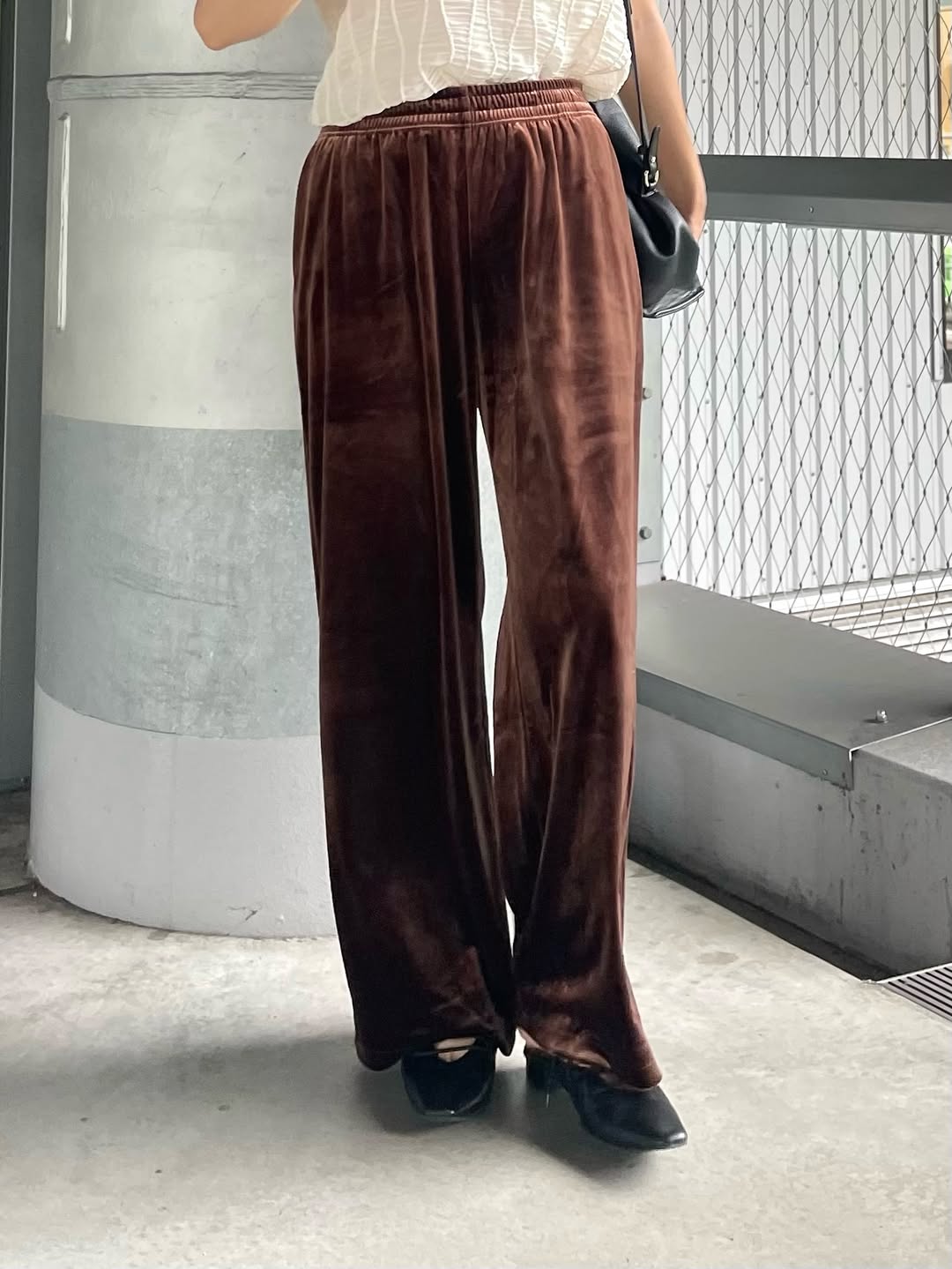 夏場ならデニムパンツを合わせそうな装いは、秋のトレンドカラーであるブラウンのソフトベロアイージーパンツで季節先取り!