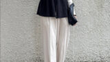 オフホワイトのボリューム袖ブラウスをネイビーのライトデニムベルテッドワイドパンツにインし、ブラックのシャーリングドローストリングバッグ&ゴールドバックルパンプスを合わせたスタイルアップコーディネート。