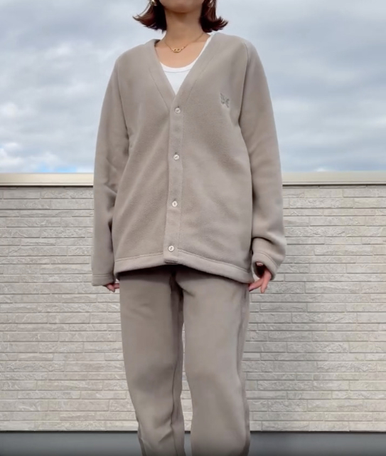 UNIQLOのフリース素材のセットアップは、今年とくに話題のNEEDLESコラボラインから登場した人気アイテム。カーディガンはオーバーサイズながら落ち感がきれいで、体が大きく見えない絶妙なシルエットに仕上がっています。